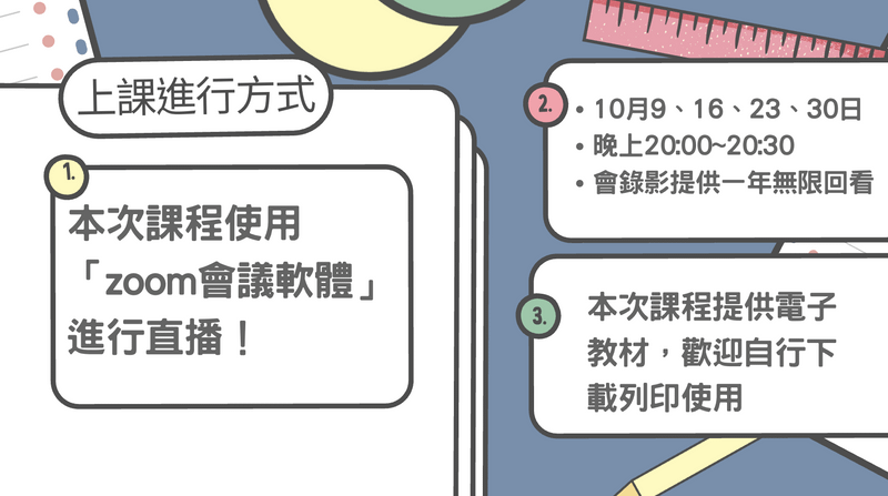 - 課程時間:10月9、16、23、30日,晚上20:00~20:30,會錄影提供一年無限回看
