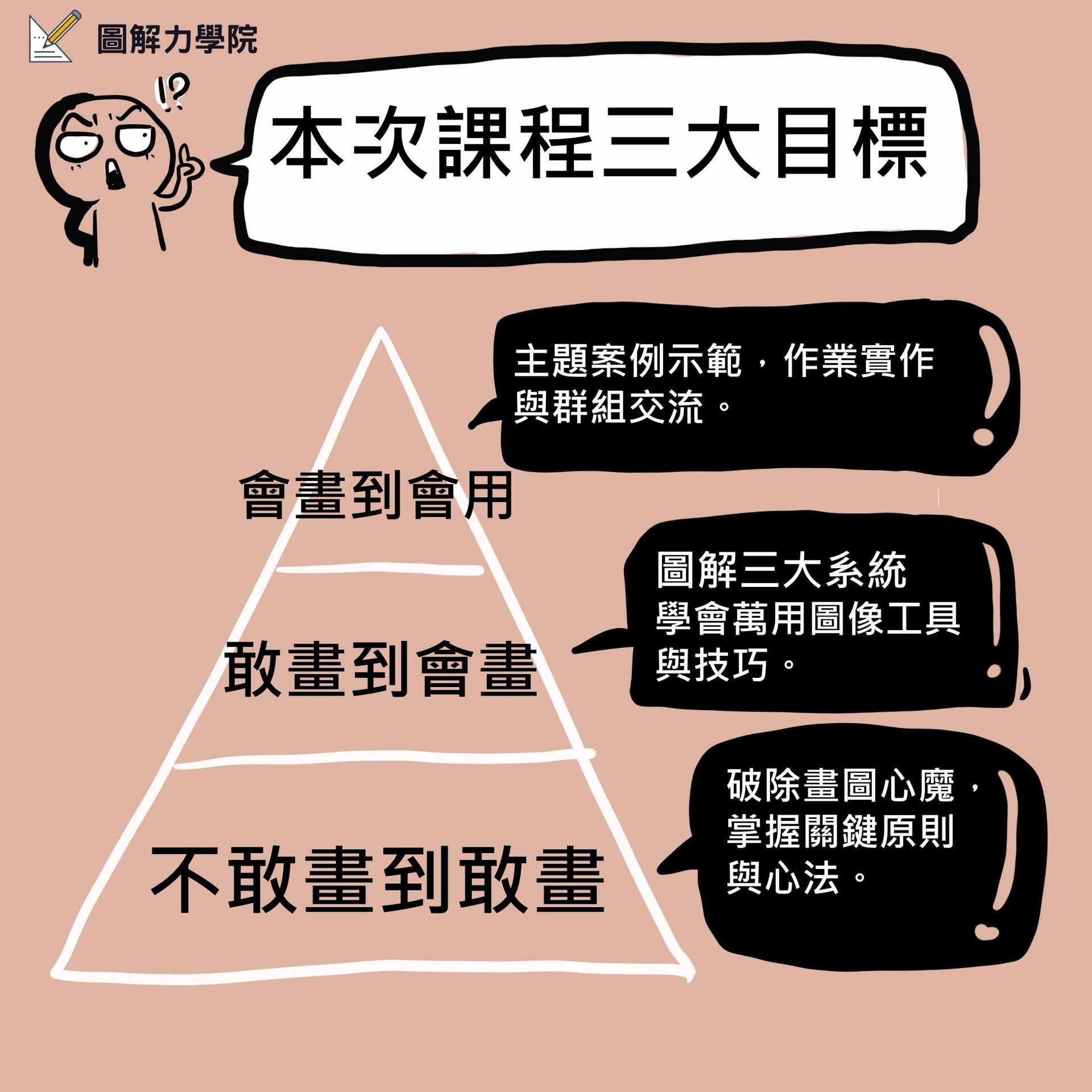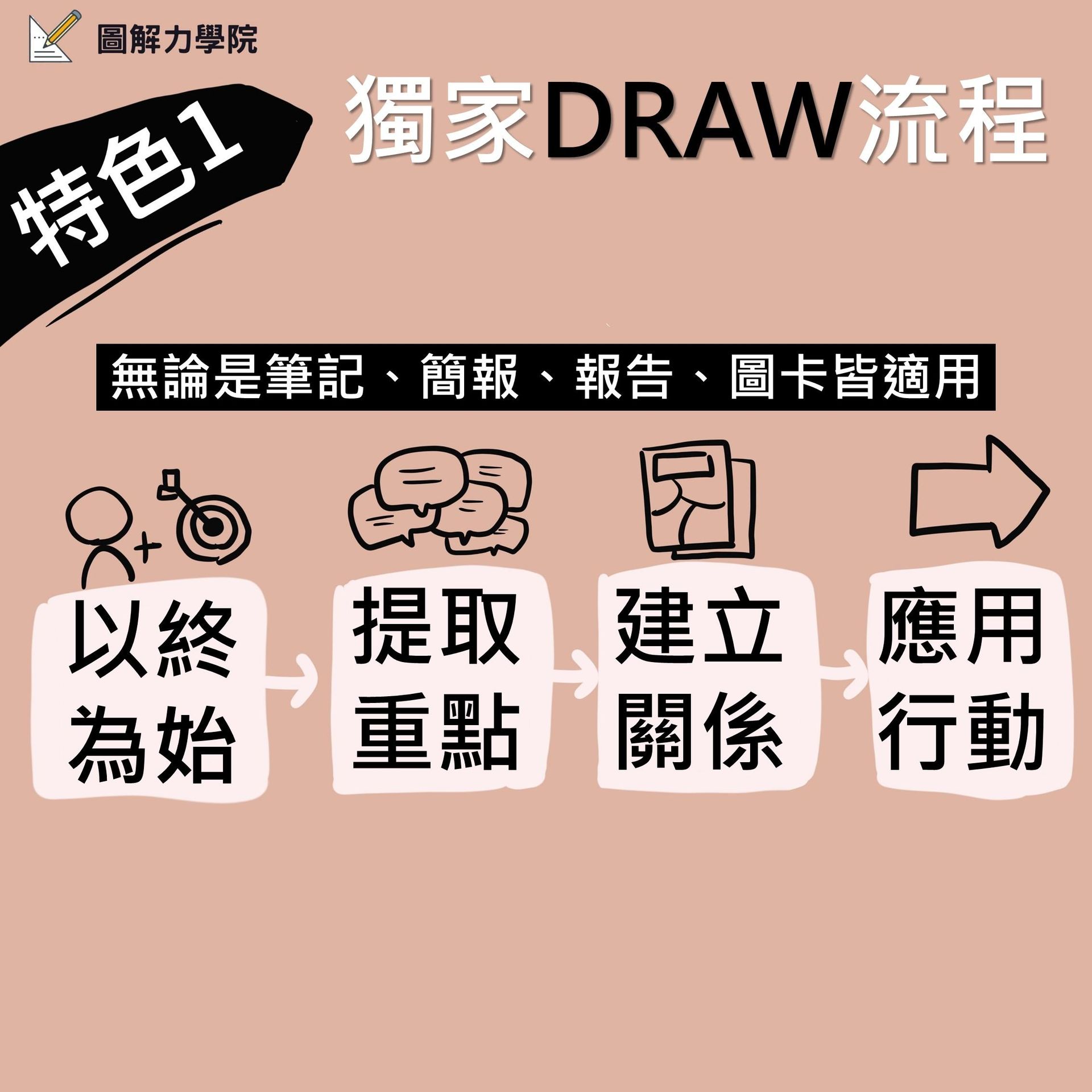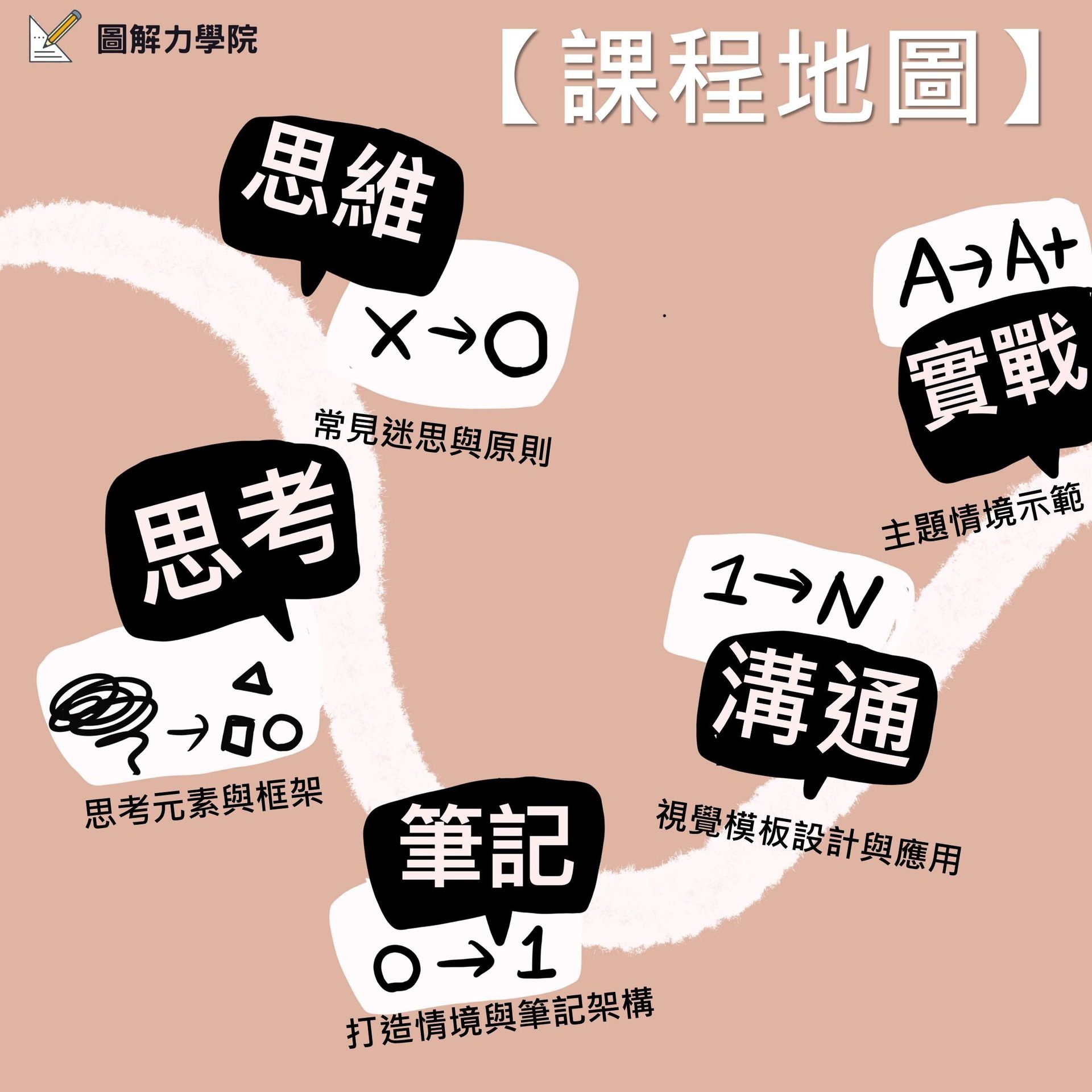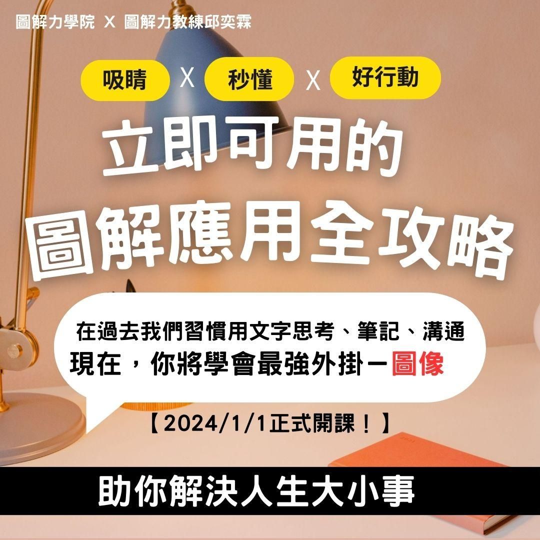 課程內容包含: 1.30堂單元錄製課程 2.12場主題直播 3.學習交流群組,QA解答 4.線上版AI圖解力教練 4.獨家「圖解筆記」實體卡牌