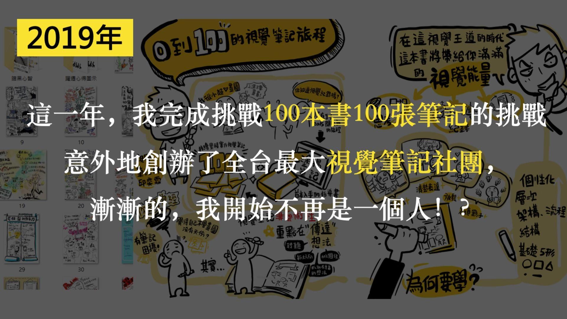 於是我做了一個關鍵的行動,那就是「100挑戰」,在2019年完成閱讀100本書,畫100張視覺筆記!