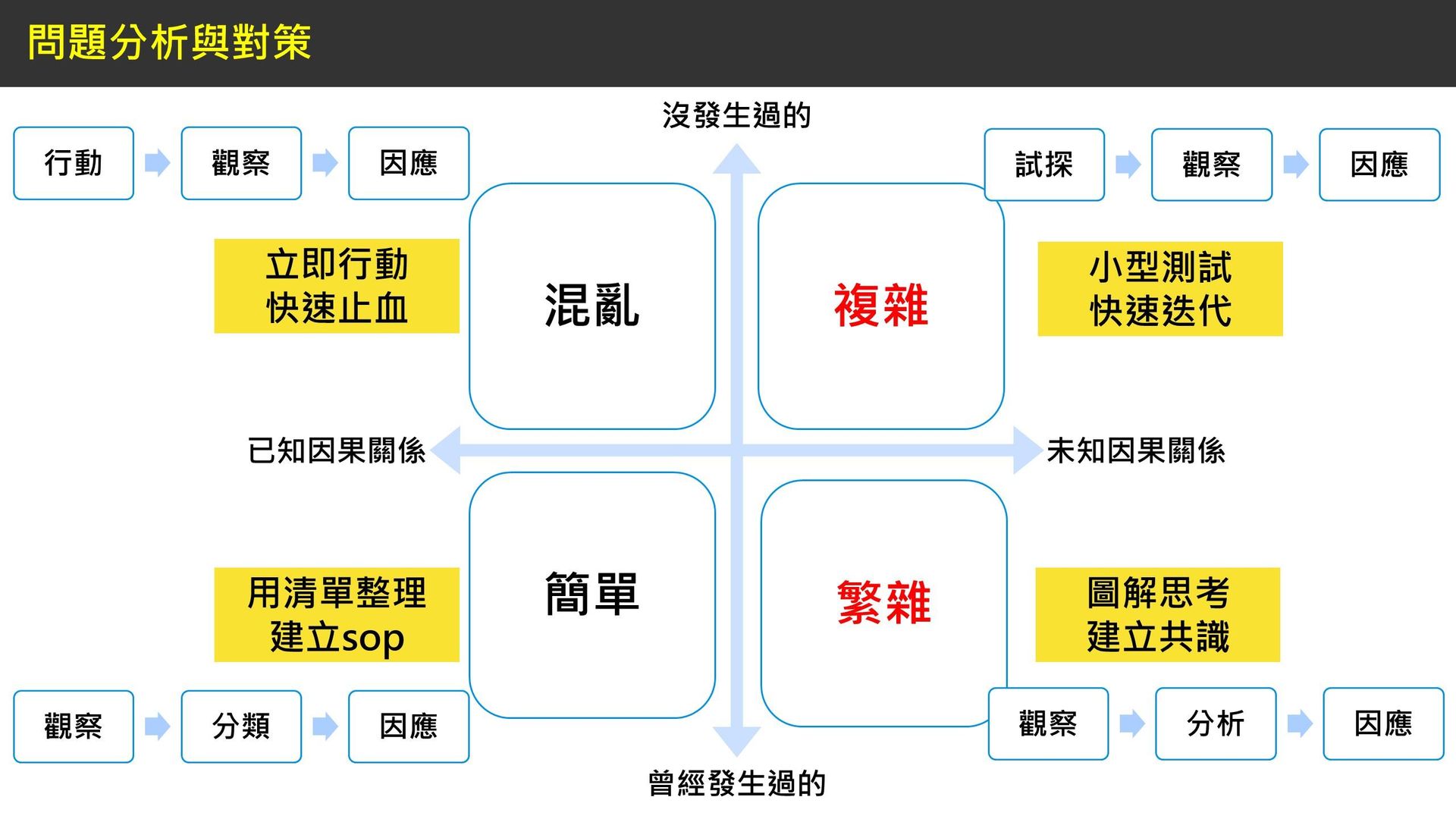 那些你沒遇過、沒有過往經驗參考,且不清楚背後的因果關係,這類型的問題如開發新市場、拓展新的商業模式等(其實這類的問題將越來越多,因為VUCA時代的來臨),面對這類型的關鍵就是【敏捷】,可做小規模測試,如同設計思考中的打造原型或敏捷的小型增量,然後快速收集客戶反饋、即時修正迭代。