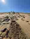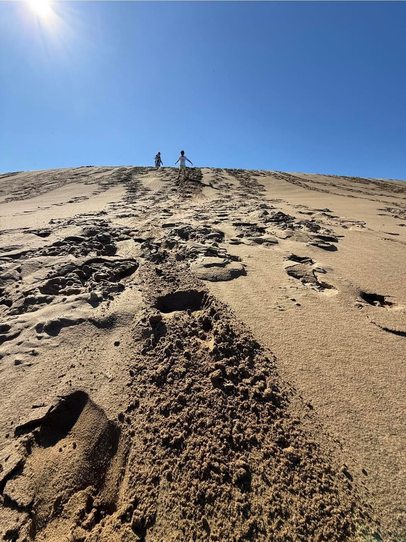 沙丘很陡,大約有 45 度角。我走在前面,刻意踩得深一點,留下一串清晰的大腳印,好讓他們踩在我的路上比較安全。前幾步,他們確實跟著走,但當我抵達海邊回頭一看——他們的腳印早就偏離了我的軌跡,各自走出了不同的路線。