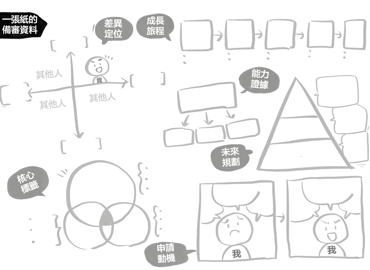 我自己很常使用的一個方法,是用六張圖把整個備審資料的結構先整理出來。當這六張圖清楚之後,其實很多文字內容就自然長出來了。