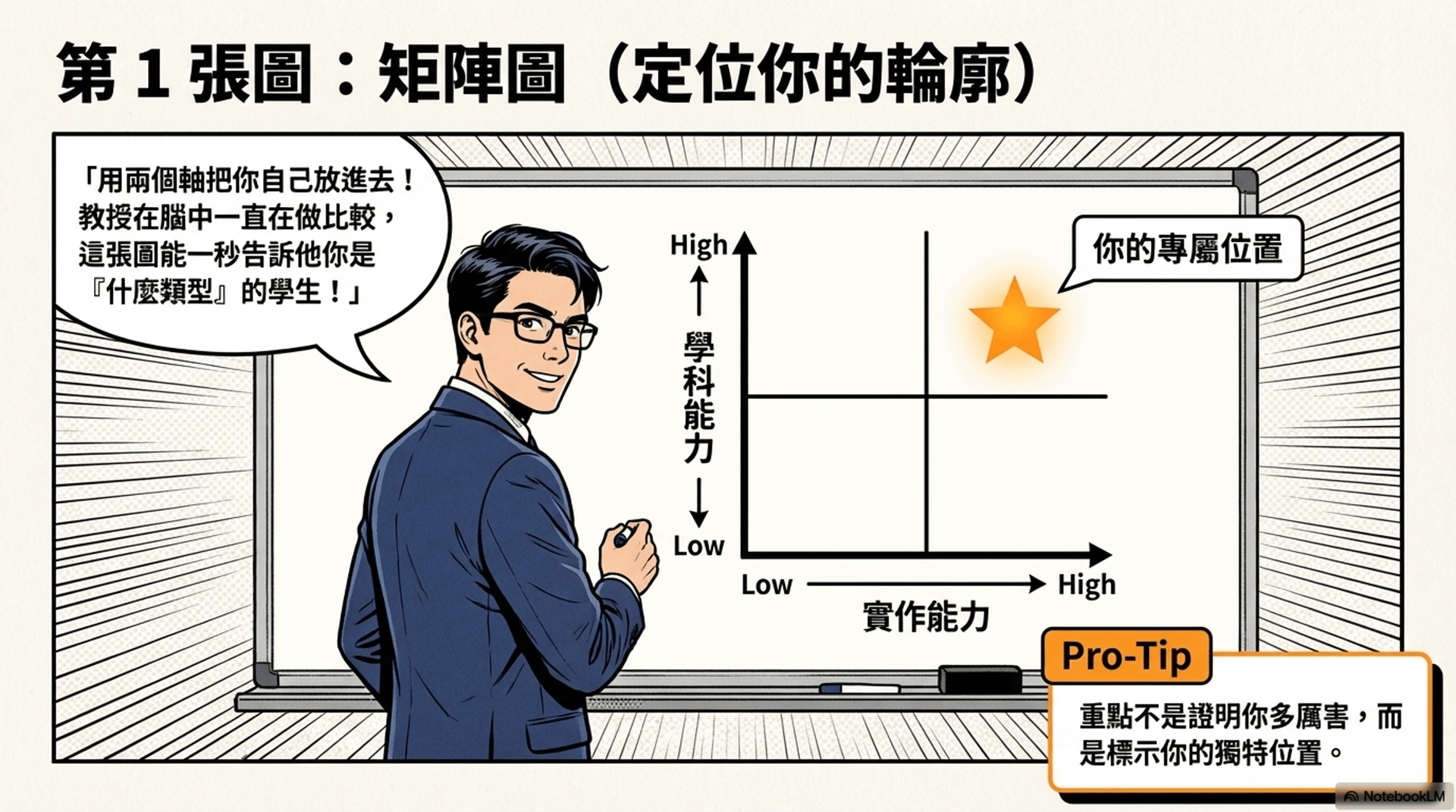 當你把自己放在矩陣裡,評審就會很快理解你的輪廓。這張圖的功能不是證明你多厲害,而是讓人知道你是什麼類型的學生。
